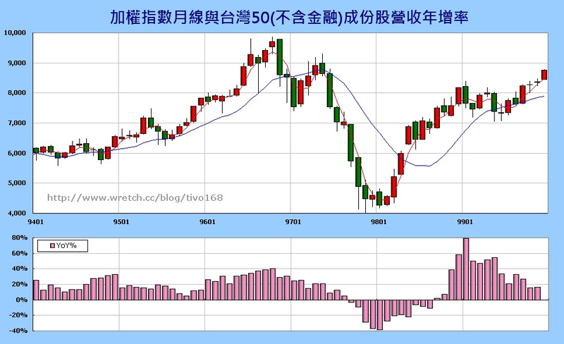 台灣50非金單月營收及長短期營收趨勢 VS 加權指數月線