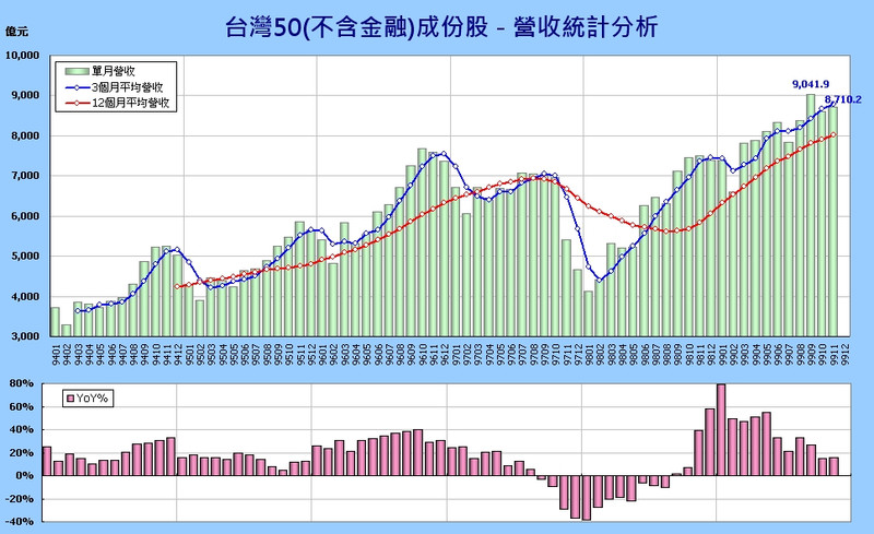 台灣50非金單月營收及長短期營收趨勢 VS 營收年增率